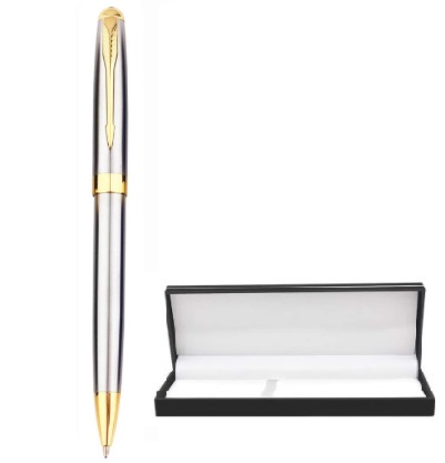 Bolígrafo de color plata de diseño elegante que combina el estilo con la funcionalidad. Escritura suave con punta redonda y tinta de gel color negro.
