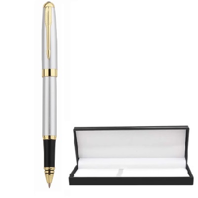 Bolígrafo de color plata de diseño elegante que combina el estilo con la funcionalidad. Escritura suave con punta redonda y tinta de gel color negro.