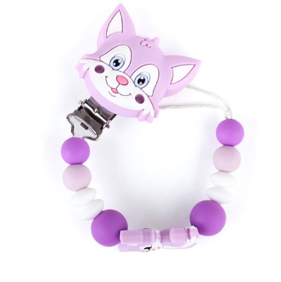 Cadena sujeta chupete para bebé. Cuentas de silicona de grado alimenticio, cadena de dentición anticaída para recién nacido. Cadena de color lila con figura de gato. Esta cadena no se puede personalizar.