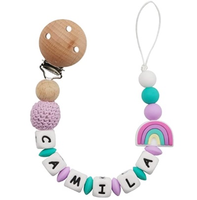 Chupetero personalizado para bebé. Bola crochet y pinza redonda de madera con letras de silicona antibacterianas. Chupetero de arco iris en color lila.