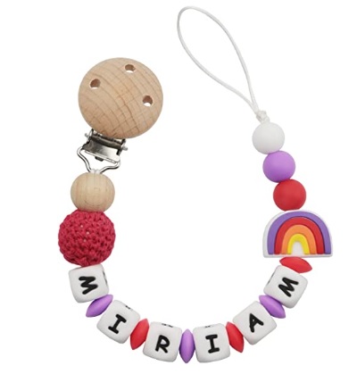 Chupetero personalizado para bebé. Bola crochet y pinza redonda de madera con letras de silicona antibacterianas. Chupetero de arco iris en color rojo.