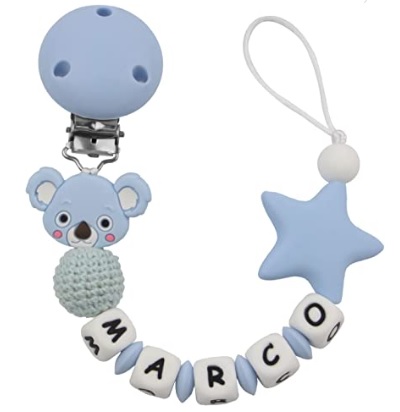Chupetero personalizado para bebé. Bola crochet y pinza redonda de madera con letras de silicona antibacterianas. Chupetero de koala en color azul.
