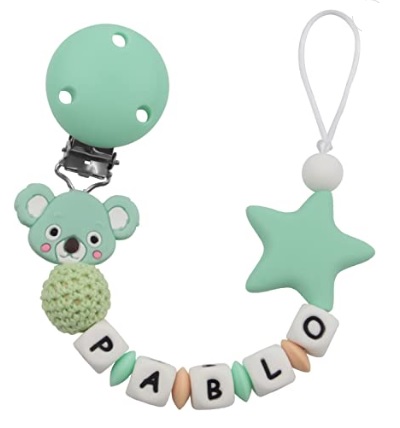 Chupetero personalizado para bebé. Bola crochet y pinza redonda de madera con letras de silicona antibacterianas. Chupetero de koala en color menta.