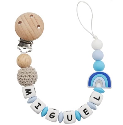 Chupetero personalizado para bebé. Bola crochet y pinza redonda de madera con letras de silicona antibacterianas. Chupetero de arco iris en color azul.