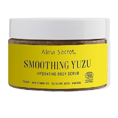 Smoothing Yuzu Body Scrub es el exfoliante corporal de Alma Secret. Un exfoliante corporal nutritivo que transforma la piel reseca, escamosa o con asperezas en una piel lisa, suave y luminosa. Un tratamiento efectivo que une exfoliación física + enzimática, con aceites nutritivos no comedogénicos y activos vegetales que van a renovar y mejorar la piel.Formulado con Azúcar Orgánico, Alfahidroxiácidos (AHA) (Ácido Glicólico, Láctico, Cítrico, Málico y Tartárico) y enzimas de Papaya. Una combinación efectiva que elimina las células muertas de la superficie de la piel y las renueva a dos niveles (superficial y profundo) mejorando la textura de la piel. Está potenciado con Ácido Succínico, un ingrediente con actividad antimicrobiana y queratolítica que ayuda a eliminar las células muertas, evitado que los poros se obstruyan. Está enriquecido con Avena ecológica y harina de Arroz, que reconfortan la piel y reducen el enrojecimiento mientras la Manteca de Karité y los aceites de Almendras y Oliva se encargan de repararla y nutrirla. Un exfoliante indulgente y sensorial de aroma cítrico y dulce que combina la súper fruta Yuzu con Mandarina, Naranja, Pomelo y Albaricoque.