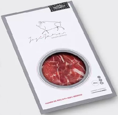 Estuche de Jamón de Bellota 100% Ibérico. Presentado en packs de 5  unidades en blíster individuales de 60 gr.