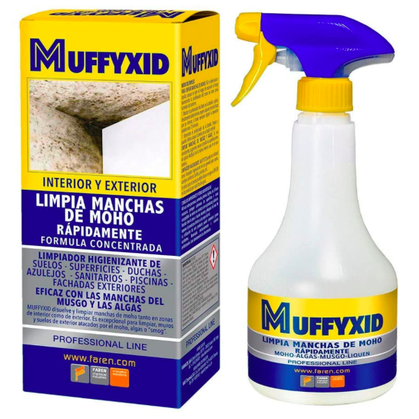 Muffyxid-500. Tratamiento para la disolución y limpieza de manchas de moho en paredes y revestimientos murales, tanto en zonas de interior como de exterior. Es excepcional para limpiar, muros y suelos de exterior atacados por el moho, algas o musgo.