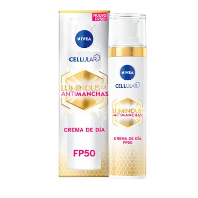 NIVEA Cellular Luminous 630 Antimanchas Crema de día FP50, una fórmula de textura ligera que combina el ingrediente altamente eficaz LUMINOUS630® con un alto factor de protección solar (FP50), y está enriquecida con Ácido Hialurónico, Vitamina E y filtros UVA/UVB.