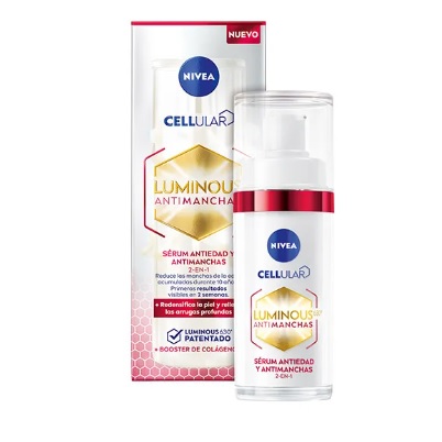 NIVEA Cellular LUMINOUS630® Sérum Antiedad y Antimanchas 2 en 1 combina el poder de reducción antimanchas del ingrediente patentado LUMINOUS630® con la experiencia de NIVEA en cosmética antiedad. Este sérum reduce manchas de la edad acumuladas durante 10 años en 2 semanas. Fortalece la estructura de la piel, reafirma y redensifica. Rellena incluso las arrugas profundas en 7 días.