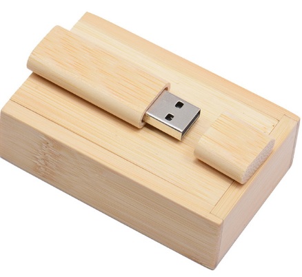 Pendrive USB de 64 GB de memoria. Terminado en madera color carbonizado y caja con la misma terminación.