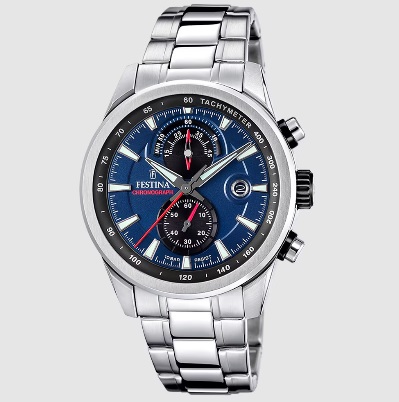 Reloj Festina F20694/5 para hombre. Caja de acero inoxidable con forma circular de 44 mm. Color de la esfera en azul. Bisel de acero. Funciones: Calendario, Cronógrafo, TaquÃmetro. El cristal es mineral, movimiento cuarzo y el display analógico. Resistencia al agua hasta 100 m. Correa de acero inoxiable 316l.