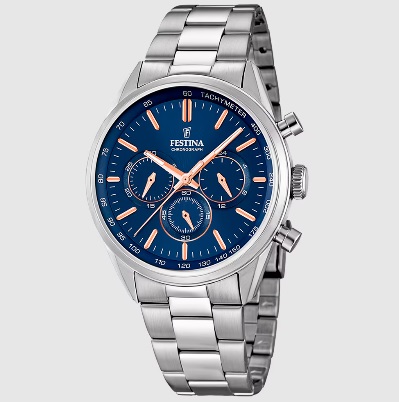 Reloj Festina F16820/A para hombre. Caja de acero inoxidable con forma circular de 43,5 mm. Color de la esfera en azul. Bisel de acero. El cristal es mineral, movimiento cuarzo y el display analógico. Resistencia al agua hasta 50 m. Correa de acero inoxidable 316l. con cierre de doble pulsador.