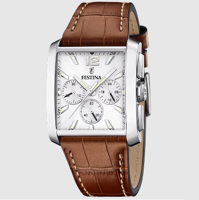 Reloj Festina F20636/1 para hombre. Caja rectangular de acero inoxidable de 38 mm. Color de la esfera en blanco. El cristal es zafiro, movimiento cuarzo y el display analógico. Resistencia al agua hasta 50 m. Correa de piel en color marrón con cierre de hebilla.