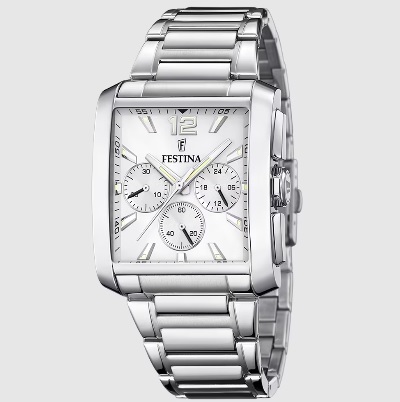 Reloj Festina F20635/1 para hombre. Caja rectangular de acero inoxidable de 38 mm. Color de la esfera en blanco. El cristal es zafiro, movimiento cuarzo y el display analógico. Resistencia al agua hasta 50 m. Correa de acero con cierre de doble pulsador.
