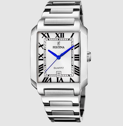 Reloj Festina F20677/1 para hombre. Caja rectangular de acero inoxidable de 40,5 mm. Color de la esfera en blanco. El cristal mineral con movimiento cuarzo y el display analógico. Resistencia al agua hasta 50 m. Correa de acero con cierre desplegable.