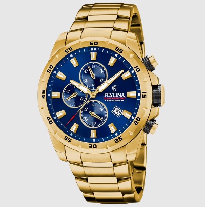 Reloj Festina Cronógrafo F20541/2 para hombre. Caja circular de acero inoxidable de 45 mm. Color de la esfera en azul. El cristal mineral con movimiento de cuarzo analógico. Resistencia al agua hasta 100 m. Correa de acero en color oro con cierre de doble pulsador.