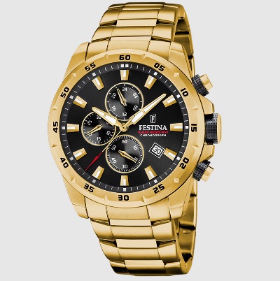 Reloj Festina Cronógrafo F20541/4 para hombre. Caja circular de acero inoxidable de 45 mm. Color de la esfera en negro. El cristal mineral con movimiento de cuarzo analógico. Resistencia al agua hasta 100 m. Correa de acero en color oro con cierre de doble pulsador.