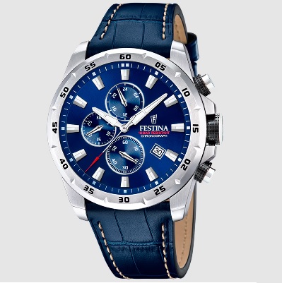 Reloj Festina Timeless F20692/2 está orientado para hombre. Caja de acero inoxidable de 45 mm. con forma circular. Color de la esfera en azul. Numeración y agujas en acero. Bisel de acero. Funciones: Cronógrafo. El cristal es mineral, movimiento cuarzo y el display analógico. Resistencia al agua hasta 100 m. Correa de piel en azul con cierre de hebilla.