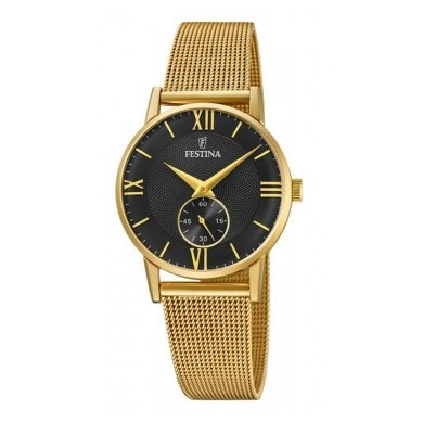 Reloj clásico marca Festina (F20573/4),está orientado para mujer, tiene la caja de acero chapada en oro, con forma circular. El armis es de malla de acero milanesa chapado en oro y el bisel dorado. Color de la esfera negra. El cristal es plexiglas, el movimiento cuarzo y display analógico. Impermeable: 3 ATM. Diámetro: 29 mm. Funciones: 3 agujas.